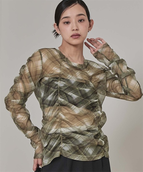 ■Point・ギャザーのボリューム感:シャーリングデザインでふんわりとしたシルエットが女性らしさを演出し、かわいらしさを引き立てます。・大胆なチェック柄のプリントチュール生地:インパクトのあるチェック柄がコーディネートにアクセントを加え、トレンド感をプラス。・程良い透け感:シアー素材で軽やかさと抜け感を持たせつつ、程よい透け感で大人っぽい雰囲気も演出。・着やすいデザイン:シンプルでありながらも華やかさを兼ね備えたデザインで、デイリーコーデにも活躍する一枚です。■Coordinate・カジュアルスタイル:デニムやショートパンツと合わせて、ラフでこなれたカジュアルコーディネートにぴったり。・きれいめスタイル:タイトスカートやスラックスと合わせて、上品なスタイルにも。・レイヤードスタイル:インナーにタートルネックやアメスリトップスを合わせて、シアー感を活かした着こなしが楽しめます。シャーリングデザインとシアー素材で、さりげない華やかさをプラスするシャーリングシアートップスで、デイリーから特別な日までおしゃれに楽しめます。※当商品は機械による生産の過程上、どうしても"生地を織る際の糸の継ぎ目"や多少の"ほつれ"、他繊維の"混紡"、また、形やサイズや柄に多少の"誤差"が生じる場合がございます。※サイズは、実寸サイズを測っているため多少誤差がでる場合があります。製造工程の関係上、各採寸箇所実寸(平置き)より【約-3cm~+3cm】程度は誤差の許容範囲とさせて頂いておりますので、予めご了承くださいませ。※メーカーより密封状態で入庫し、検品時に再度袋詰めを行っておりますが、素材により染料等の臭いが強い場合がございます。※発送上の状態によって商品がシワになる場合がございます。※商品により色落ち・色移りがある場合がございますので、品質表示をご確認の上、お取り扱いにご注意くださいませ。【伸縮性】あり【透け感】あり