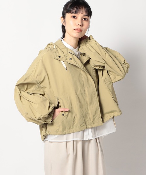 ボリューム袖ショートパーカージャケットボリューム袖がポイントのショートマウンテンパーカーです。もともと生地表面に表情があるナイロン素材なので、シワを気にせず着用できます。軽くて、スポーティな雰囲気が特徴です。袖がゆったりしているので、カジュアルトレーナーの上にもストレスなく羽織れます。■pointすっきり着れるややショートめな着丈で、前後差がついています。着ると少し後ろに抜けるので、カジュアルなこなれ感が出ます。ワイドめな身幅に加え、ギャザーが入ったボリューム袖が絶妙なバランスです。■detail*比翼ZIP+ボタン*袖口の幅調整のスナップあり*フラップポケットあり*フード紐あり*裾ドロスト仕様■fabric……………………透け感:なし裏地:なし伸縮性:なし光沢感:ナイロンのツヤあり生地の厚さ:薄い洗濯方法:手洗い可……………………※詳しいお手入れ方法は商品タグをご参照ください■coordinate*近年トレンドのボリュームボトムにもバランス良く合わせられます。*パンツ・スカート・ワンピースなど迷わず羽織れます。