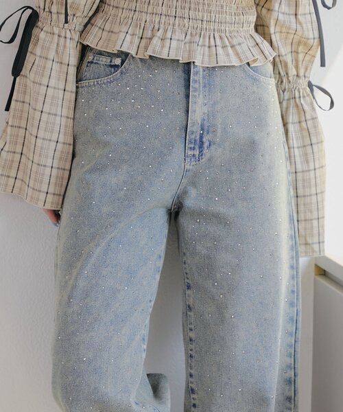 【continuer de NICE CLAUP】動くたびにキラキラ光るストーン付きデニムパンツ■ デザイン・きらっと光るストーンが魅力のデニム。・履けば履くほど体になじむ柔らかくナチュラルな風合いです。・ウェスト後ろゴム入りで履き心地良く、きれいなワイドシルエットのラインが美脚効果抜群。■スタイリング・Tシャツやスウェットなどのカジュアルアイテムに合わせるとデニムを引き立ててくれるおすすめなスタイリングに。・レースものやフリルブラウスなど女性らしいアイテムあわせは好相性でバレエコアなコーデも楽しめます。■素材・さりげないヴィンテージ感と、ストーンのキラキラがマッチしたデニム。=========================洗濯方法:手洗い透け感:なし裏地:なし伸縮性:なし光沢感:ストーン部分の煌めきあり=========================-INFORMATION-◆商品のお気に入り登録・完売していても再入荷時に再入荷通知を受け取ることができますので、是非ご登録ください♪◆ブランドのお気に入り登録・新商品や再入荷などの情報を受け取ることができますので、是非ご登録ください♪※屋外の光や照明の当たり具合で、実際の商品の色味とカラー別画像の色味に違いが発生する場合がございます。 商品の色味はスタジオ撮影の詳細画像にてご確認ください。※ご注文いただいた予約商品のお届け時期の確認は、注文履歴ページより行えます。◆返品・キャンセルについて・着用・洗濯後の返品・ご交換は致しかねます。・商品到着後、着用前に商品を確認して頂きますようお願い致します。