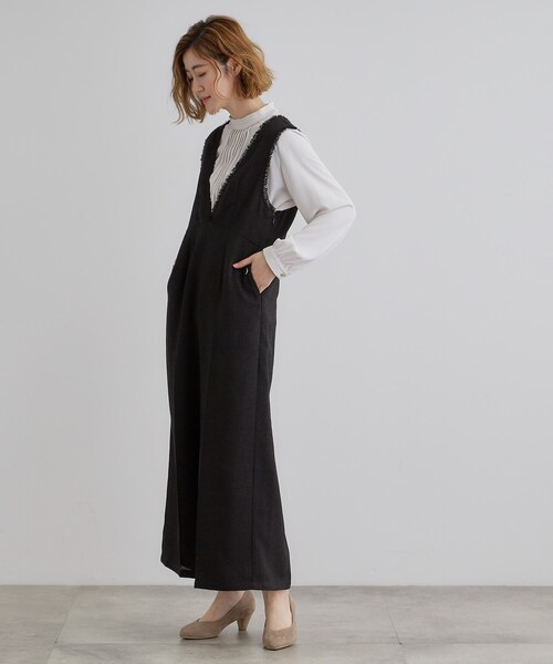 今着たい! 大人のためのツイードサロペット 【デザイン】 1枚で旬顔にきまる上品ツイードで仕上げたトレンドサロペットです。 一見カジュアルな印象のサロペットですがきちんと見えするツイード素材にすることで、大人が着易い上品な雰囲気に仕上げました。 ウエスト切り替えをフロントは中心に向かってV字に入れることで、すっきり足が長く見えるようにお作りしました。 フロントは深めのVネック開きでシャープな印象で着用頂け、 ボウタイやフリル等ボリュームのあるブラウスを合わせてもバランスよくきまります。 ポケット部分には飾りボタンをあしらって共の金縁くるみデザインが上品さとさり気ないポイントになっています。 【素材】 温かみが少ないさらりとした質感のツイード素材を採用。 表面感のある糸使いでぺったり見え過ぎない高見えする仕上がりです。 奥行きが感じられるMIX感ある色使いも特徴です。 【スタイリング】 ブラウスやシンプルなインナーを合わせてトレンドのスタイルが叶います。 ブラウスを合わせてオケージョンやモチベーションにも対応でき、シンプルなリブのインナーを合わせて普段使いにも◎ 【仕様】 ・ポケット数:横×2 ・左脇ファスナー ・裏地あり ※照明の関係により、実際よりも色味が違って見える場合があります。また、パソコン・スマートフォンなどの環境により、若干製品と画像のカラーが異なる場合もございます。 モデル情報:身長166cm B80 W59 H86 着用サイズ:02(M) 店舗へのお問い合わせ商品番号:768-52013 ●製品寸法: 01(S):着丈130cm B90cm W85cm H101cm 股下57cm 前股上41cm 渡り幅34cm 裾幅33cm 02(M):着丈132cm B93cm W88cm H104cm 股下58cm 前股上41cm 渡り幅35cm 裾幅34cm 03(L):着丈134cm B96cm W91cm H107cm 股下59cm 前股上41cm 渡り幅36cm 裾幅35cm 04(LL):着丈136cm B99cm W94cm H110cm 股下60cm 前股上42cm 渡り幅37cm 裾幅36cm 05(3L):着丈136cm B102cm W97cm H113cm 股下60cm 前股上42cm 渡り幅38cm 裾幅36cm 備考:
