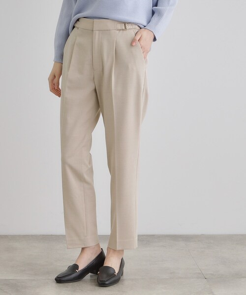ストレッチで快適、どんな日も美脚パンツ【デザイン】脚を美しく見せるテーパードシルエットが特徴のパンツ。ウエストのサイドベルトとゴールドのDカンがアクセントとなり、シンプルながら洗練された印象に。センタープレス入りで縦ラインを強調し、スタイルアップ効果も高いです。【素材】タテヨコに伸びる2WAYストレッチ素材を使用。動きやすさと快適さを兼ね備え、デイリーにもお仕事にも最適です。しなやかでほどよい厚みがあり、オールシーズン使いやすい素材感が魅力です。ご自宅の洗濯機で洗えて扱いやすいのも嬉しいポイント。【スタイリング】ブラウスをタックインしてサイドベルトを際立たせた上品なコーディネートや、ニットやカジュアルなトップスを合わせて抜け感のあるスタイルもおすすめ。【仕様】・ポケット数:横×2 後ろ×2・前ファスナー・ウエスト後ろゴム・裏地なし※こちらの商品はやや透け感があります。※照明の関係により、実際よりも色味が違って見える場合があります。また、パソコン・スマートフォンなどの環境により、若干製品と画像のカラーが異なる場合もございます。【25SS】モデル情報:身長166cm B80 W59 H86 着用サイズ:02(M)店舗へのお問い合わせ商品番号:768-62018●製品寸法:01(S):W67~71cm H93cm 股下64cm 前股上26cm 渡り幅30cm 裾幅16cm02(M):W70~74cm H96cm 股下65cm 前股上26cm 渡り幅31cm 裾幅17cm03(L):W73~77cm H99cm 股下66cm 前股上26cm 渡り幅32cm 裾幅17cm04(LL):W76~80cm H102cm 股下67cm 前股上27cm 渡り幅34cm 裾幅18cm05(3L):W79~83cm H105cm 股下67cm 前股上27cm 渡り幅35cm 裾幅18cm備考: