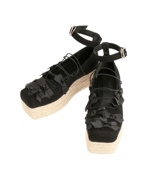 ■デザイン トウシューズにようなデザインが可愛い厚底のジュートサンダルが登場! 夏の足元を涼しく可愛く魅せてくれる、心ときめく一足。 ■サイズ感 足首のベルトでサイズ調整が可能。中敷きはふわっとした低反発を使用しています。 ■スタイリング ワンピースやパンツなど、いつものスタイルに合わせて夏らしい奮起のスタイリングに◎ 【商品情報】 透け感:なし 裏地:あり 伸縮性:なし 光沢感:なし 生地の厚さ:普通 甲部分のリボン3つは丸紐と重なるように、シューズ土台に縫い付け固定されています。 ※写真ではリボン固定されていないので丸紐部分でリボンが動いてしまっている状態ですが 生産商品分はすべてのリボンが固定されています。