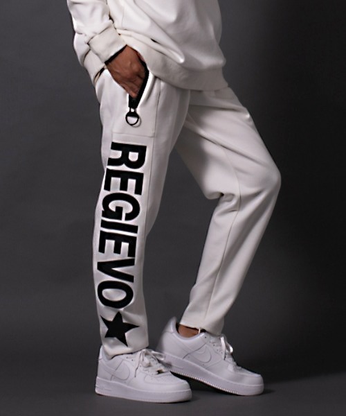 スタイリッシュシルエットがスマートなジョガーパンツ アンクル丈で膝下がすっきりしたシルエットだから、 部屋着感を感じさせないスマートなジョガーパンツです。 ソフトで膨らみがありストレッチ性のある素材だからこそ 表面がクリアでに表現されています。 また再度の切り替えによる立体的なパターンと膝下からのシェープが シャープなシルエットを実現しており、 足首がすっきりするのは 内側に設けた目立たないコンシールファスナーを設けているからです。 再度の切り替えに大胆なロゴを配置し、 サイドポケットの大きなファスナーもデザインの一つとして 全体を引き立てています。 同素材のプルパーカー(品番25506)とセットアップで着用できるように、 ロゴの配置も左右のバランスが計算されています。 【REGIEVO】 REGIUS EVOLUTION (華麗なる進化) トレンドに流されない、 大人の為の STYLISH & COMFORT なデザインを追求するブランド