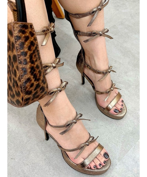 リボンがポイントのロングサンダルです。ふくらはぎ周りのリボンディテール部分はゴム仕様にしておりフィット感が出ます。グリッター生地でハードになりすぎないラメ感のある素材を使用しているため、女性らしさのあるサンダルです。