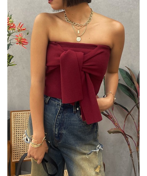 ■デザインEVRIS(エヴリス)定番のリボンニットビスチェです。1枚での着用はもちろんシャツやTシャツとのレイヤードもおすすめです。後ろにゴムが入っているため安定感のある着心地が魅力。新色にレッドが仲間入り。■スタイリングタイトなシルエットなので、ボリュームのあるボトムとの合わせがおすすめ。ワイドデニムやルーズなスウェットが◎-------------- 透け感:なし 裏地:なし 生地の厚み:普通伸縮性:あり--------------