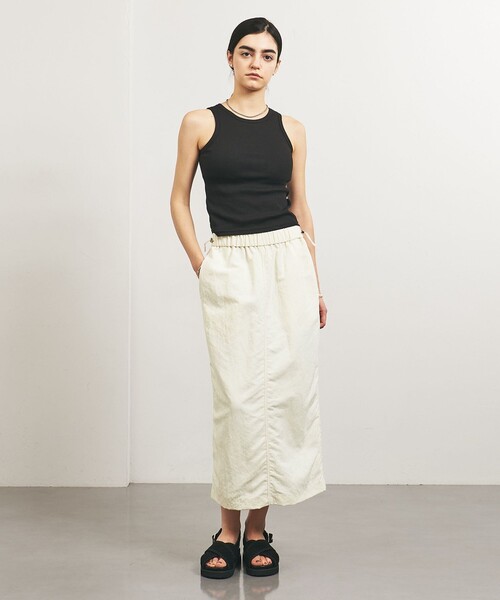 パラシュートパンツをイメージしたロングスカート ■デザイン ゆったりとしたシルエットとバックスリットを入れた足さばきの良いデザイン。 ウエストはゴムとドローコードでフィット感の調整が可能。 ポケットはジップで開閉するこだわりのディテールに仕上げています。 適度な厚みがあり安心感のあるナイロンツイル素材にシワ加工を施したラフな雰囲気が魅力的です。 ■素材 リサイクルナイロンを使用。 ■コーディネート クロップド丈のTシャツやタンクトップをインしてすっきりと着こなすのがおすすめ。 ヨガやトレーニング終わりにレギンスの上にさっと着られるファッショナブルなアイテムとしても注目です。 ============================ 裏地:なし 透け感:OFF WHITEはややあり 伸縮:なし 光沢感:ややあり 機能性:リサイクルナイロンを使用 ケア方法:手洗い可 ============================ <TO UNITED ARROWS(トゥー ユナイテッドアローズ)> TO - “~と" 心と身体、環境と人、様々なものを繋ぐ。 TO - 目標へ向かい、必ず到達すること。 気持ちと身体を軽くする、セカンドスキンのようなヨガウェア。 街からスタジオまで、日常に馴染むカジュアルウェア。 心と身体が喜ぶ、自分らしく楽しむ日々のためのライフスタイル・ファッション。 TO BE BETTER. よりよい世界へむかい、 TO BE MYSELF. ありのままの自分へ向かう。 【注意事項】 ※商品を使用前に、タグ等に記載されている「取り扱い上の注意書き」、「洗濯表示」を必ずご確認ください。 ※商品画像は、光の当たり具合やパソコンなどの閲覧環境により、実際の色味と異なって見える場合がございます。あらかじめご了承ください。 ※商品の色味の目安は、商品単体の画像をご参照ください。 ※画像の商品はサンプルです。実際の商品と色味、仕様、加工、サイズ、素材等が若干異なる場合がございます。 店舗へお問い合わせの際は、全国のUNITED ARROWS各店舗まで下記の品名/品番をお申し付けください。 品名:TO/24 N TWL GATH90 品番:15832990195