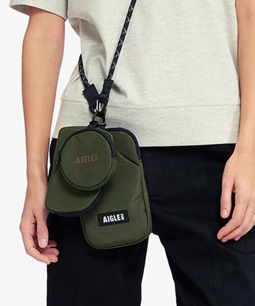身の回りの必需品を持ち運ぶのに最適なサイズ感のショルダーポーチです。カードケースや小銭などを収納できるサブポーチも付属しています。WR持ち手付きサブポーチジッパー開閉のバッグ開口部メインポーチ フロントサイドポケットメインポーチ メインルーム バックサイド スリーブポケットバッグ用 AIGLE パッチリフレクター AIGLE FOR TOMORROW(再生素材や環境に配慮した生産背景を持つ商品)-素材の特徴-撥水性に優れたWRリサイクルポリエステル100%