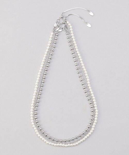 気分によってアレンジがきく3連ネックレス ■デザイン/素材 フェイクパールとチェーン2本がセットになった3連ネックレス。 異なる質感が絶妙に調和し、オケージョンから普段使いまでどんなシーンでも活躍します。 1本ずつバラバラにしたり、チェーンのみ2本重ねたりとその日の気分やコーデによってアレンジが自由自在。 重ねてつけた際に重ならないよう、3本のうち2本は長さ調整も可能です。 どれも軽やかで着け心地が良く、長時間つけても疲れにくいのもうれしいポイント。 【注意点】 ※撮影商品はサンプルの為、実際の仕様と異なる場合がございます。 ※画像の商品は光の照射や角度、お使いのモニター環境により、実物と色味が異なる場合がございます。スタジオ物撮りの画像が実物の色味に一番近くなっております。 ※予約商品の場合、お届け予定はあくまでも目安となります。 生産の都合上、お届け時期が前後したり実店舗入荷時期とずれる場合がございますので、あらかじめご了承ください。 品名:フェイクパール&ボールチェーン3連Nec 品番:76836070240