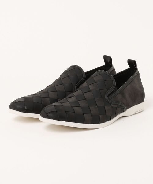 ■デザイン イントレチャートデザインのスリッポンシューズ。 アッパーは合皮テープを編み込んだ(イントレチャート)デザインになります。 スニーカーライクな薄いホワイトソールで爽やかさと軽さを演出、シャープなシルエットの木型でカジュアル過ぎず綺麗めに仕上げています。 サイドゴムを設ける事で脱ぎ履きがしやすく、かかと部分に引手を付けて履きやすく、クッション性のあるインソールを採用する事で履き心地も高めました。 ■サイズ 横幅(ワイズ)が少し細く、少し先端の長い捨て寸のある木型を採用。 スペアインソールを付けていますので、横幅(ワイズ)で合わせて着用してください。 ■素材 09ホワイトは、真っ白のスムース調シンセテックレザー。 39チャコールは黒無地のスムースと光沢の無いヌバック調ムラプリント入りシンセテックレザーを組み合わせた編み込み。 49ブラックは黒無地のスムース調シンセテックレザーのイントレチャートデザインです。 ■注意点 この製品はデザインの特性上、引っ掛けやすくなっています。 引っ掛けた場合の補修は、非常にむずかしくなりますので、着用時、保管時の取り扱いには十分にご注意ください。 それと生地の断ち切り部分を使っています。 雨の日など水分のしみ込みには劣化を早めますので十分ご注意ください。