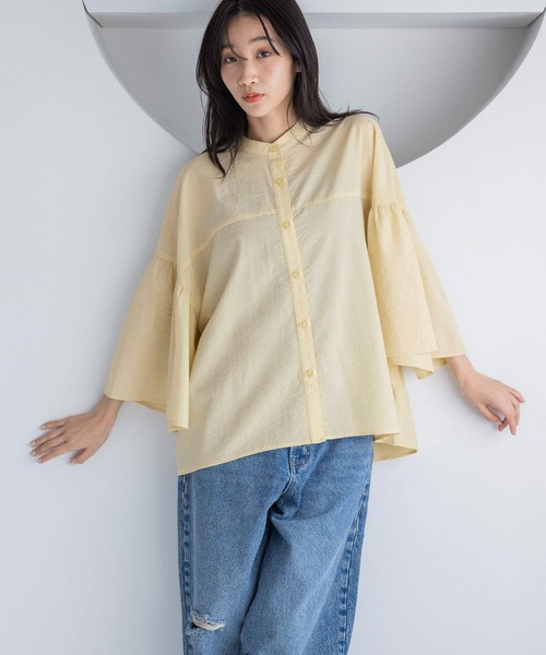 ■デザイン■ 独特の表面感と肌離れの良いドライタッチな風合いが特徴の定番ブラウス。 ゆったりとしたサイズ感、袖もギャザーを施し着心地の良さが魅力の1枚。 後ろにもはフリルデザインをプラスしてバックスタイルもポイントに。 ■スタイリング■ パンツ、スカートどちらとも相性よく着用可能。 すっきりとしたシルエットのボトムと合わせるとよりバランスよくスタイリングを楽しめます。 キャミワンピースやサロペットのインナーとしても。