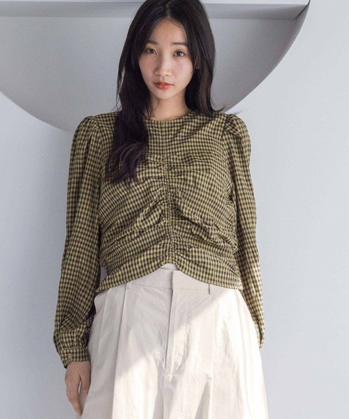 ■素材■ 部分的にシャーリングが入ったギンガムチェックの素材と、ポコポコとした表面感が特徴の無地素材を使用しています。 ■デザイン■ 前後にギャザーを施し立体的に仕上げたブラウスです。前後2wayで着用することができます。 袖にもギャザーを入れて適度なゆとり、ボリュームを持たせ、インしなくてもバランスよく着ていただける丈感にしています。 ■スタイリング■ パンツ合わせがおすすめです。デニムなどカジュアルボトムが特に相性抜群です。 ボリュームのですぎない大豆感にしているので、ワイドパンツなど太めのボトムともバランスよく着ていただけます。