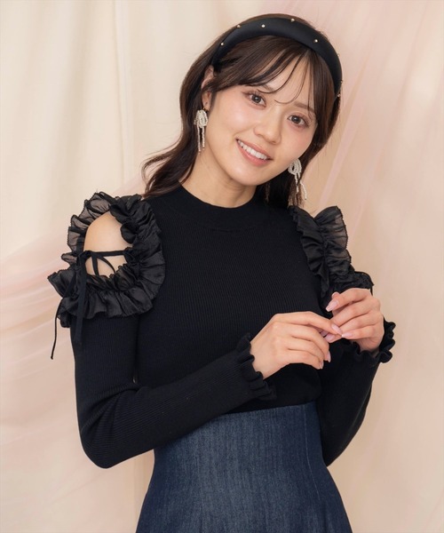 オーガンジー生地のフリルテープがアクセントになったプルオーバー【Design】・たっぷりフリルのオープンショルダーがフェミニンムードを高めてくれます。・フリル部分はオーガンジー生地を使用し、ほんのりとした透け感がコーディネートの透明度をアップ♪・ややハイネックめに仕上げた襟ぐりと、フリルテープ&共リボンが露出を抑え、程よい肌見せ感でご着用いただけます。・袖口もフリルデザインになっており、手元まで可愛く仕上げた一着◎・伸縮性の良いリブニットなので着心地もよく、合わせるボトムを選ばない着回し抜群アイテムです。・ウエストインしやすい着丈なので、ハイウエストなボトムスと合わせても着ぶくれせずスッキリと着こなしが可能!【Fabic】・着心地のよい、伸縮性のあるリブニットを使用。・ご自宅でお手入れが出来るのも嬉しいポイント♪・エクリュ、ピンク、ブラックの3色展開となります。【Care】手洗い可能F:(00):着丈50cm/身幅35cm/肩幅30cm/袖丈58cm/袖巾12cm/袖口巾9cm/裾回り68cm