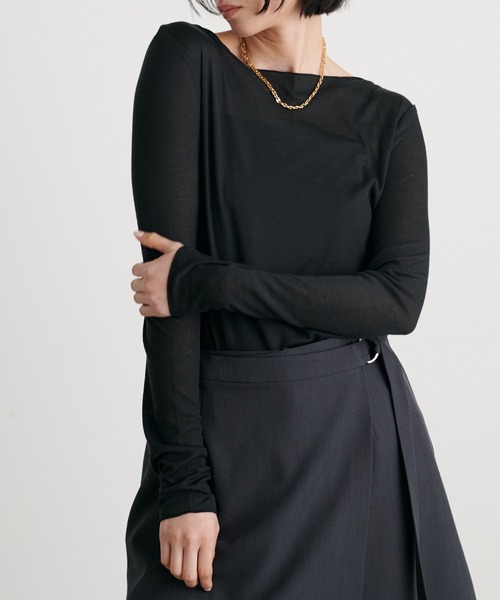 【2025SS LARUTA】 とろみシアーロンT ■Design とろみのある滑らかな生地感が上品なカットソー。 伸縮性が高く肌あたりが良いのが特徴で、素肌に着てもストレスフリーなのが嬉しいポイント。 ボートネックの襟ぐりでデコルテ周りをすっきりとさせ、 長めのスリーブで自然と腕を長く見せてくれるデザインです。 コーデに抜け感をプラスしてくれる程よいシアー感は、インナーとしてお使いいただいても◎。 1枚ではもちろん、レイヤードアイテムとしても万能なこれからの季節大活躍の一着です。 ■Styling 透け感をお楽しみいただくため、カップ付きのキャミソールの上に着ていただくのが◎。 麻混テーラードジャケットや金釦テーラードジャケットのインナーとしてお召いただくのがおすすめです。 シンプルなデザインなので、大ぶりのアクセサリーをお付けいただくとより華やかな印象に。 とろみナロースカートやチュールスカートなどで、大人っぽくスタイリングしたり マルチWAYラップスカート付きパンツやサイドフリンジデニムパンツなど、ラフに合わせたりと 様々な雰囲気のちがいをお楽しみいただける1枚です。 ■Fabric とろみのあるマットな質感の素材。 滑らかで素肌にお召いただいても快適にお過ごしいただけます。 ========================= 透け感:あり ポケット:なし 裏地:なし 伸縮性:あり 光沢感:なし ========================= ▼ コンセプト <LARUTA> シンプルだけど洗練されていて、それでいて自然体。 着飾るよりも着ていてリラックスできる、そんなお洋服を纏いたい気分。 ※着用、お取り扱いの際は、商品に付いている品質表示とアテンションタグを必ずご確認ください。 【お気に入り登録でお得な情報がいっぱい】 ・「商品のお気に入り登録」で再入荷通知や、ラスト1点の通知、セール通知をいち早く受け取ることができます。 ・「ブランドのお気に入り登録」で新商品や再入荷など、お得な情報を受け取ることができます! ※店舗の入荷時期は商品によって異なります。 店頭の在庫状況につきましては各店舗にてお問い合わせください。 ※撮影時の光の関係で、画面上の画像と実際のお色とでは若干の色差が生じる可能性がございます。 また、ご覧いただいているモニター画面や、お使いのブラウザによっても、お色の違いがございますことをあらかじめご了承くださいませ。