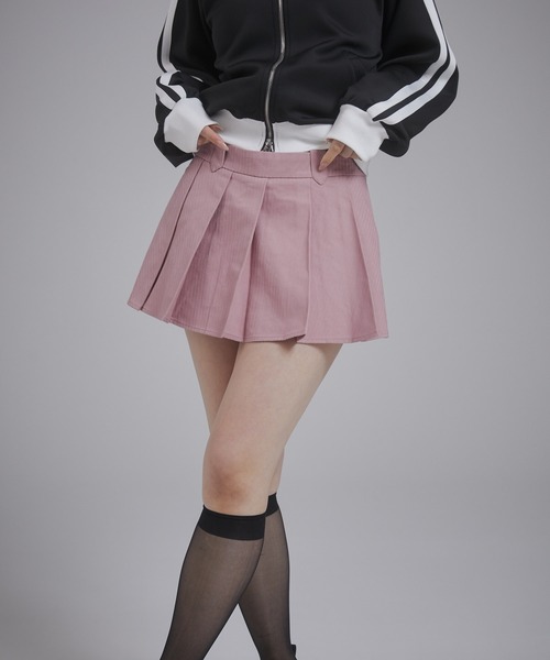 ■ポイント特徴的な生地が魅力のプリーツミニスカート!■ディティールストライプ柄がうっすらとあるツイル生地を使用しておりスカートでも甘すぎない1着。ローライズで履くことによってトレンド感のあるスタイリングに。※インナーパンツ付です。■スタイリング同生地を使用したテーラードボクシージャケットとセットアップでの着用がおすすめ。レースレギンスをレイヤードするのも◎