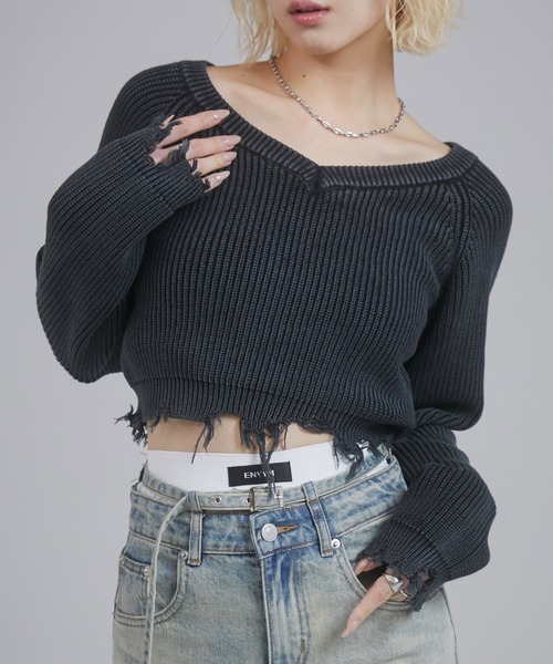 ■ポイントENVYMでは人気のピグメントニットが春も登場!■ディティールデコルテがスッキリ見えるVネックニット。ネックを広めに設定しているので、ワンショルのように着こなすのも◎全体的にピグメント加工+裾、袖、首回りにランダムなダメージを入れて主役級なトップスです。コンパクトなサイズ感でショート丈なのでトップスとしてもアウターのインナーとしても活躍します。■スタイリングショート丈なので太めのパンツ等で合わせるとバランスよく着こなせます!シャツなどをレイヤードして着用するのもおすすめです。▼商品のお気に入り登録完売カラーの再入荷通知や、ラスト1点の通知、セールの通知など商品の情報をいち早く受け取ることが出来ます。▼ブランドのお気に入り登録新商品や再入荷等、いち早くブランドのお得な情報を受け取ることが出来ます。
