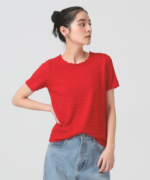 シンプルながら着回しが効く万能アイテム■デザイン凹凸感のある表面が特徴的なシュリンク風の素材を使用したTシャツ。 シンプルなクルーネックのデザインが、独特な表面感を際立たせます。■コーディネート1枚で着るのはもちろん、キャミワンピやオーバーオールのインナーとしても重宝します。■サイズフィット感のある素材を使用したやわらかな着心地も魅力。■素材ポリエステル素材にストレッチが効いています。■ケア方法手洗い可(詳細は商品についている品質表示ラベルをご覧ください)【RED】Model:H168 B81 W60 H89 Size:ONE SIZE【OFF_WHITE・BLACK】Model:H170 B79 W59 H86 Size:ONE SIZE※光の当たり具合やパソコンなどの閲覧環境によって、実際の色味と異なって見える場合がございます。予めご了承ください。※商品の色味は商品単体で撮影した画像をご参照ください。