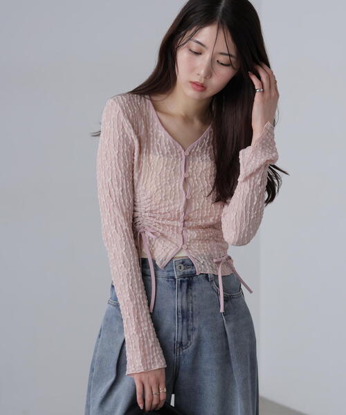 【NEW COLOR】追加生産分より春にぴったりな新色ピンクが登場!<4月上旬-下旬お届け予定>〔fabric&design〕総レース素材のトップス。ボタン開きでカーディガンとしても使用できます。フロント切替部分にドロストギャザーを施し、バレエコアなディティールをプラス。Vネックと袖口のスリットで抜け感を出し1枚で様になるデザインにしました。程よいフィット感でスタイルアップして見えます。〔stylinig〕デニム合わせでも韓国っぽい着こなしが叶う1枚。カップ付きインナーとレイヤードして、下のボタンを1つ外して着るのがおすすめ!■透け感:あり■生地の厚さ:薄手■裏地:なし■伸縮性:あり■光沢:なし■シルエット:スタンダード※モデルの着用画像の場合、光の当たり具合により、実際の色味と異なって見えることがございます。---------------------------------------------------◆商品のお気に入り登録◆お気に入りアイテムの値下げ・再入荷・在庫1点などの通知を受け取ることができます。◆ブランドのお気に入り登録◆新商品や再入荷、セール、クーポン配布などお得な情報を受け取ることができます。---------------------------------------------------