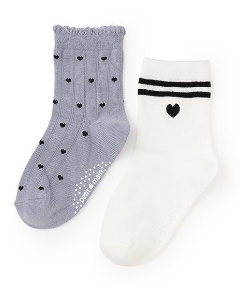 ハートとラインのデザインを2足組にしたソックスです。 着こなしによって選べるのがうれしいポイント。 はき口の内側にはお名前を記入できるスペースをつけました。 かかとフィットで脱げにくく、足裏にすべり止めが備わっているのも魅力です。