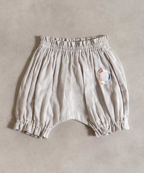 ギャザーがたっぷりの長く使えるブルマ。 ■商品説明 [デザイン] ・シンプルなデザインなので、ボディやロンパースに重ねたり、セパレートのトップスに合わせたりと色々な組み合わせが楽しめて、長くお使いいただけます。 ・5色の輪のモチーフには空色の青は無限の可能性、大地をイメージする黄色は心の豊かさとすくすくと成長することへの願い、太陽のオレンジは生命力やエネルギー、薄桃色は純粋さ、やさしさが広がるイメージ。宇宙の広がりをイメージした深い青緑は個性や才能を生かして知識を深めるという意味を込めました。 [素材] ・通気性の良いコットン100%素材です。 ・優しい肌触りのダブルガーゼを使用しています。 「Hommage(オマージュ)」は、山、海、風、そして虹と出会うように、大自然にいきづく美しい色、 年月とともに形を変えながらも長くあり続ける自然に敬意を表し、 長く着続けることができるデザインを考え名付けたシリーズです。 [生地について] NAOMI ITOおよびHommage de NAOMI ITOの製品は、水彩画家・テキスタイルデザイナー 伊藤尚美さんの水彩画の意匠をそのまま生地に表現し、手書きによる配色やグラデーション、刷毛跡の風合いをお楽しみいただけます。 ・水彩画をそのまま表現しているため生地に絵具の濃淡が見られることがございます。 ・生成りの生地でぽつぽつとした黒い点が見られる場合がありますが自然な風合いを生かした綿の葉や茎の一部です。自然のものなので一切害はなく、使っていくうちに自然と減っていきます。 ・生地の裁断箇所によって商品ごとにパターン(柄)が異なっていくため掲載画像とパターンの位置や内容が異なる場合もありますが、不具合品ではありません。 ・パターン(柄)の出方をお選びいただくことはできません。 ■素材 コットン100% ■サイズ 50-70cm/70-90cm ■生産国 日本