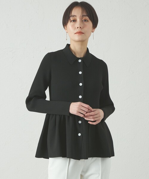 【CAST:キャストコロン 2025年春夏アイテム】 【Design】 ペプラムシルエットのリブニットカーディガン。 ポロ衿タイプできちんと感があり、配色ボタンが全体を引き締めてくれます。 バストの少し下からシルエットが広がっていて、お腹周りを拾わず、すっきり着用頂けます。 ボタンを全部留めて1枚着としても活躍します。 【Fabric】 ハリのある素材感と軽さが特徴のニット素材を使用しています。光沢感のある糸なので、キレイ目に見えるのがポイント。 【Styling】 細身のパンツやクロップド丈のワイドパンツ等との相性が良いです。 オンにもオフにも合わせやすいデザインなので、汎用性抜群です。 ●洗濯:手洗い可 透け感:なし 伸縮性:あり 生地の厚さ:普通 おすすめ着用期間:春、秋 ※この商品はサンプルでの撮影を行っています。 実際の商品とイメージ、サイズ、品質表示、原産国等が異なる場合がございます。 ※店頭及び屋外での撮影画像は、光の当たり具合で色味が違って見える場合があります。商品の色味は、スタジオ撮影の画像をご参照ください。