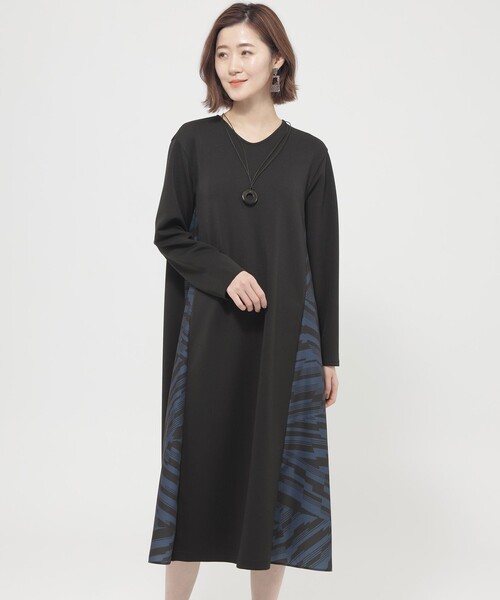 【ウォッシャブル】ランダムゼブラコンビワンピース身頃はジャージー素材、脇にはプリント素材を使用したコンビワンピース。ジャージーのダンボールニットはソフトで軽く、快適な着心地です。シーズンレスに活躍するきれいめカジュアルなワンピースです。【素材】ジャージー部分には、ポリウレタンの入ったストレッチダンボール素材を使用。布帛部分には、ポリエステルスパン糸で織られたスパンローン素材を使用。オリジナルのグラフィカルなゼブラ柄が、存在感を与えてくれます。程良いハリ感のある素材なので、綿タッチでありながらもすっきりとした印象に仕上がります。(春夏展開商材)
