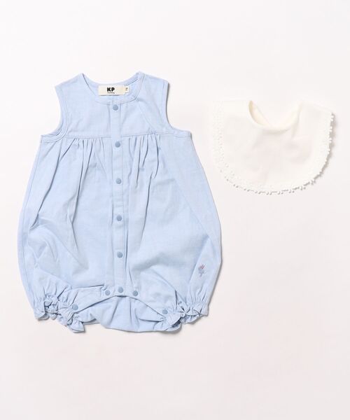 スタイが付け衿にもなる爽やかなシャンブレー素材のロンパース。スタイの中心をひもで止めつけるとリボン型の付け衿に早変わり。雰囲気が違って見えます♪左裾のうさぎのmimiちゃんのシルエット刺繍がさりげなくアクセントになっています。お出かけ着やギフトにもおすすめのアイテムです。