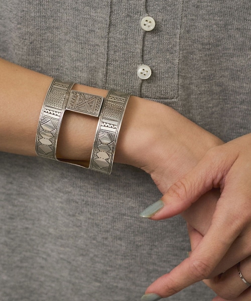 ■デザイン/シルエット サハラ砂漠に生活する遊牧民族、トゥアレグ族による伝統工芸。 職人のハンドメイドにより施された細かく美しい文様が存在感のあるバングルです。 かつて某有名メゾンがこのシルバーに惚れ込み、 トゥアレグシリーズがあることでも有名です。 シンプルなスタイルをはじめ様々なコーディネートのアクセントとしてご使用頂け、 ひとつあると着こなしが華やぐアイテムです。 ※SALON adam et rope'直営店舗・ジャドールジュンオンライン限定展開の商品となります。 ※ブローチのみの販売です、ネックレスとして使用している紐は付属しておりませんのでご注意下さい。 ■バイヤーズコメント サロンの定番としてトゥアレグを扱っていますが、 今年はアルファベットのブローチを作りました。 作りたい文字と形のイメージを伝えて、 あとは現地の方の自由な発想で彫っていただくのですが、 サンプルが上がってきて素晴らしさにとても感動しました・・! ブローチとしてはもちろん、お好きなコードやリボンを通してネックレスやチャームとしても使えるように作っています。 クラフトワークの誠実な美しさを楽しんでいただきたいなと思います。 【メーカー型番・カラー・サイズ】 サイズ:F カラー 93シルバー:silver ※サイトカラー表記とメーカーカラーが異なる場合がございますので 必ずこちらをご確認お願いします。 【TUAREG(トゥアレグ)】 高い工芸技術とデザイン性をもつトゥアレグの人々は、アフリカのサハラ砂漠を支配したベルベル系の遊牧民です。 特に砂漠でのコンパスをモチーフとしたトゥアレグ・クロスは、 かのエルメスがデザインに取り入れたことで世界的に有名になりました。 紋章をかたどったペンダントは、 親から子へと代々受け継がれ、 出身地や氏族などを示すパスポートとして今なお使われています。 これらの手作り品は、 「お守り」としての大切な役割もあります。 雄大なサハラ砂漠を活動の場とする遊牧民トゥアレグの、ロマン溢れる工芸品です。 【ご購入にあたっての注意点】 ※こちらの商品は、ご注文後のキャンセル及び返品交換はできかねます。 ※この商品は、 代引きでの購入を制限させて頂きます。 決済方法を商品代引きにてご注文のお客様に関しましては、ご注文をキャンセルさせて頂く場合がございますので、予めご了承下さい。