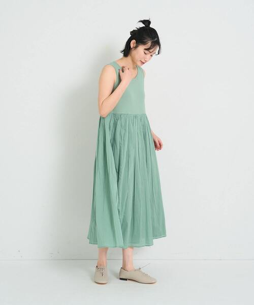 1枚でもワンピースのレイヤードアイテムとしても。毎年大人気のワンピースに新色登場。 【素材】 軽さが特徴の80/-ボイルの生地と、綿カットソーを使用しています。 【アイテム】 congés payés定番のカットソー×布帛テクニックのノースリーブワンピース。 1枚着としてはもちろん透け感のある素材を使用したアイテムのインナーとしてもOKです。 羽織ワンピースとの重ね着にも便利で着回し抜群のアイテムです。 *今シーズンは胸の切り替え位置を、少し下げて、より1枚着として着やすいバランスに調整しています。 *製品洗い *画像の商品はサンプルです。実際の商品とは仕様・加工・サイズ・素材が若干異なる場合がございます。 *画像の商品は光の照射や角度により、実物と色味が異なる場合がございます。予めご了承ください。 ---------------------------------------------------------------------- ■洗濯:手洗い○ ■透け感:あり ■裏地:なし ■伸縮性:身頃部分はあり ■光沢感:なし ---------------------------------------------------------------------- 【ブランド情報】 congés payés/コンジェ ペイエ congés payés =有給休暇 リラックスできるコンフォータブルな服。天然素材をベースに、ライフスタイルに寄り添うエフォートレスアイテムを提案します。 ---------------------------------------------------------------------- 【お気に入り登録】がオススメです!! □商品のお気に入り登録□ 再入荷、残り1点、セールなどの通知を受け取ることができます。 →商品ページ ♡ をクリック ■ショップのお気に入り登録■ 新商品や再入荷、クーポン発行、ショップニュースなど、いち早くショップの情報を受け取ることができます。 →「♡お気に入りショップに追加」 をクリック ----------------------------------------------------------------------