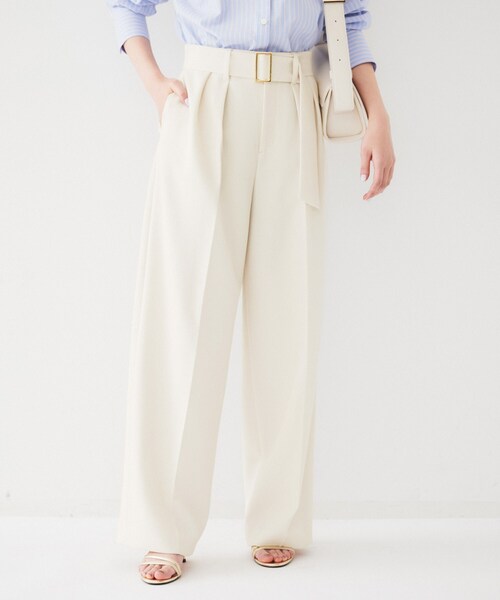 【デザイン】軽量感のある素材感の2タックパンツ。脇線を少し丸く見えるラインに設計した今年らしいシルエットになっています。ウエストには共地のベルトが付いています。金属のバックルがシャープな印象になっています。【素材感】スパンタッチで反撥感のある特殊ポリエステル糸を使用した中肉のツイル素材。安心感のある肉感なのに軽量で膨らみ感があるのが特徴で仕立て栄えします。【着こなしポイント】153-42310/82311とのスタイリングがおすすめです。【仕様】・ポケット数:横×2 後ろ×2・前ファスナー・裏地なし※こちらの商品はやや透け感があります。※照明の関係により、実際よりも色味が違って見える場合があります。また、パソコン・スマートフォンなどの環境により、若干製品と画像のカラーが異なる場合もございます。モデル情報:身長166cm B80 W58 H83 着用サイズ:02(M)店舗へのお問い合わせ商品番号:153-62310●製品寸法:00(XS):W67cm H103cm 股下64cm 前股上29cm 渡り幅34cm 裾幅24cm01(S):W70cm H106cm 股下73cm 前股上29cm 渡り幅35cm 裾幅25cm02(M):W74cm H110cm 股下73cm 前股上30cm 渡り幅36cm 裾幅26cm03(L):W77cm H113cm 股下74cm 前股上30cm 渡り幅37cm 裾幅27cm04(2LT):W80cm H116cm 股下74cm 前股上31cm 渡り幅38cm 裾幅28cm42(2L):W84cm H120cm 股下73cm 前股上32cm 渡り幅40cm 裾幅29cm44(3L):W88cm H124cm 股下73cm 前股上32cm 渡り幅41cm 裾幅30cm46(4L):W92cm H128cm 股下73cm 前股上33cm 渡り幅42cm 裾幅30cm48(5L):W96cm H132cm 股下73cm 前股上34cm 渡り幅44cm 裾幅31cm50(6L):W100cm H136cm 股下73cm 前股上35cm 渡り幅45cm 裾幅31cm備考: