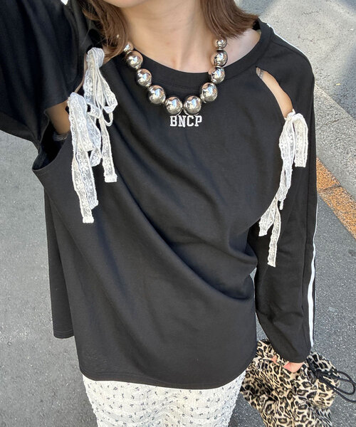 フロントロゴ刺繍×リボンレースで甘辛MIX! ▼ポイント トレンド感たっぷりのスリットラグラントップスが登場! 抜け感たっぷりの肩スリットや、シアー素材とリボンレースがバレエコアな印象に。 フロントのロゴ刺繍がカジュアルさをプラス。 サイドラインのデザインでさりげなくスポーティーさも◎ ガーリー×ストリートMIXなスタイルが楽しめる、最旬トップスです! ▼スタイリング ショートパンツ×スニーカーでアクティブにまとめれば、こなれ感たっぷりの甘めスポーティスタイルに◎ キャップやミニバッグをプラスして、トレンド感をアップさせるのもおすすめです! --------------------------------------------------- 透け感:あり 伸縮性:ややあり 裏地:なし 光沢:なし --------------------------------------------------- 家庭洗濯:30℃限度/洗濯機[非常に弱い] タンブル乾燥:不可 アイロン:低温110℃まで※スチームなし クリーニング:ドライクリーニング不可、非常に弱い処理によるウェットクリーニング可 --------------------------------------------------- ※着用、お取り扱いの際は、商品についている品質表示とアテンションタグを必ずご確認下さい。 ※画像の商品はサンプルです。実際の商品と仕様、加工、サイズが若干異なる場合がございます。 ※可能な限り実物に近いカラーにて掲載していますが、撮影環境やモニター環境などにより製品と画像のカラーがやや異なって見える場合もございます。予めご了承ください。 【お買いものをよりお楽しみいただく為に!!】 ▼商品のお気に入り登録(ハートマークをクリック) お気に入りアイテムの完売カラーの再入荷通知や、ラスト1点の通知、セールの通知も受け取ることができます。 ▼ブランドのお気に入り登録 新商品や再入荷、クーポン配布などのお得な情報を受け取ることができます。
