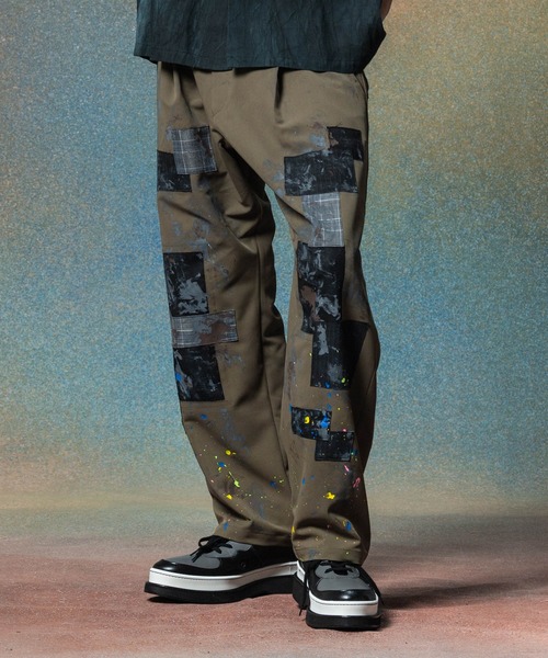 glambを代表するパッチワークシリーズである”Unplugged”のマインドをトラッドなワンタックスラックスに刻み込んだUnplugged Atelier Wide Slacks。ストレッチ混のスーツ生地を用いたボディにあしらわれたのは幾重ものパッチリペア。本来、補修として生地の上から当てられるパッチをポケットの下に挟み込むなど、手間を惜しまない仕立てによってヴィンテージリペアの手法をデザインへ昇華させました。そこへ仕上げにペイント汚しを加えることで、芸術家にアトリエで穿き込まれたかのムードを演出。ワイドシルエットのリラックスした佇まいも物語性あるデザインに違わないリアリティを感じさせます。