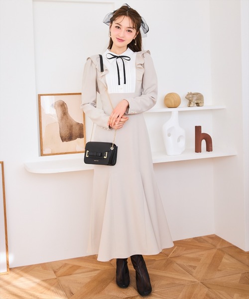 ピンタックブラウス風のヨーク切り替えがきちんと感を演出するマーメイドワンピース【Design】・フロントのヨーク切り替えとフリルが顔周りを華やかに仕上げてくれます。・フロントボタンや袖口ボタンにあしらったパールが、エレガントさをアップさせます。・細めのリボンタイが上品なアクセントをプラス♪・リボンタイの代わりにお手持ちのスカーフを結んだり、ビジューブローチを合わせても◎・ウエスト切り替えの位置を高くすることで、足を長く魅せてくれます♪・タイトすぎないソフトなマーメイドシルエットは、程よくゆとりのあるデザイン。・ウエストバックはゴム&レースアップ仕様。・背中ファスナー仕様。【Fabic】・さらりとした肌触りの、シワになりにくいポリエステル素材を使用。・程よくハリ感のある裏地付き。・ベージュ、ミント、ブルーの3色展開となります。【Care】ドライクリーニングF:(00):着丈125cm/身幅46.5cm/肩幅34cm/袖丈62cm/ウエスト70cm/裾回り285cm