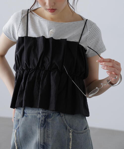 〔fabric&design〕目面がナチュラルな風合いの軽量ナイロン素材を使用。 2枚仕立て+裏地ジャージーも付いているので、透けの心配のない仕様にしています。 ウエストマークにあしらったギャザーを上端でランダムにおさえ、立体的なタックのように縫い留めたクチュールのようなデザイン性のあるビスチェの登場です。 着脱しやすいよう裏地にはジャージー素材を使用し、ウエストはゴム仕様にしています。 また肩紐の長さ調節も可能です。 〔styling〕 クチュール感のあるビスチェを敢えてデニムやカーゴパンツと合わせ、カジュアルダウンさせるスタイリングがおススメです。 ■透け感:なし ■生地の厚さ:薄手 ■裏地:あり ■伸縮性:あり ■光沢:ややあり ■シルエット:スタンダード model:骨格ウェーブ --------------------------------------------------- ◆商品のお気に入り登録◆ お気に入りアイテムの値下げ・再入荷・在庫1点などの通知を受け取ることができます。 ◆ブランドのお気に入り登録◆ 新商品や再入荷、セール、クーポン配布などお得な情報を受け取ることができます。 ---------------------------------------------------