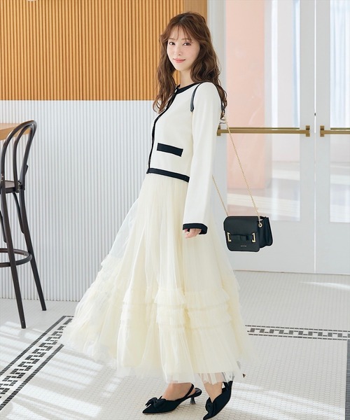 【デコラティブなチュールデザインが、周りと差をつける春らしい着映えを叶えるボリュームチュールスカート】 【Point】 ・春らしくエアリーにふわっと広がるボリュームチュールスカート。 ・トレンド感のあるフリルデザインで華やかな印象に。 ・ウエストには細かいギャザータックを施し、裾に向かって立体的に広がる360度美しいシルエットを構築します。 ・ウエストの切替を太めにすることでインスタイルもすっきりと見せます。後ろにゴムを入れることで楽ちんな着心地に仕上げました。 ケア方法:ドライクリーニング 透け感:あり 裏地:あり(エクリュのみペチコートがセットになります。) 伸縮性:なし(ウエスト部分:後ろゴムあり) 光沢感:なし 生地の厚さ:薄手 F:(00):着丈 88㎝/ウエスト 64㎝