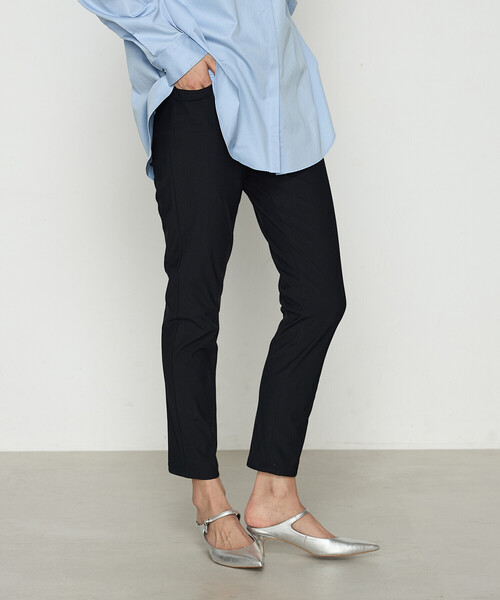《デザイン》レギンスの代わりにはもちろん、パンツとしてもおすすめな汎用性の高いストレッチパンツです。程良いフィット感と軽い着心地で窮屈さを感じさせません。生地特有のストレッチ性で履き心地が良いのはもちろんのこと、美しいシルエットに見せくれる一枚です。また、長時間履いていてもひざ抜けせずに着られるのもポイントです。はきこみは深めに、後ろウエストをカーブゴム仕様にすることでウエストになじみやすくし、スキニーパンツのタイトさは残しながら、体のラインは拾い過ぎないように、多くの方が着られるようにこだわったアイテムです。《素材》360度の抜群の伸縮性に加え、高密度でありながら通気性と速乾性に優れた生地です。適度な肉感が脚をきれいにカバーしてくれます。しなやかな柔らかさと適度なはり感で、ジャージーでもきれいめな表情の素材です。