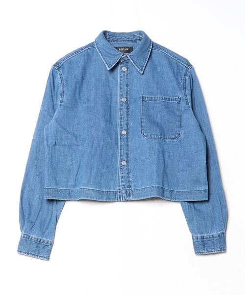 クロップド丈のデニムシャツ。この長袖シャツは、わずかにフレアな後ろ身頃、パッチ胸ポケットが特徴です。