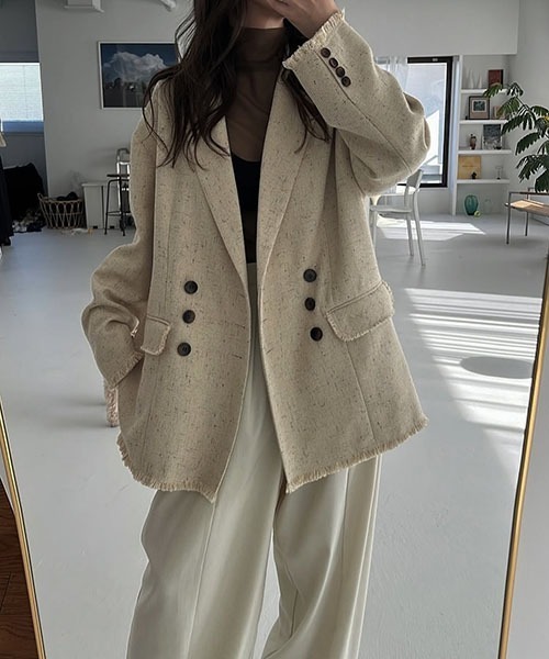 【デザインポイント】 ・ピークドラペルのオーバージャケット ・袖口、裾、ポケットフラップはフリンジ仕様でポイントに ・襟は太めのピークドラペルでメンズライクに 【スタイリングポイント】 ・春を感じさせる爽やかなカラー展開で よく見るとさまざまな色が混じったMIXカラーに ・飽きのこないアイテムなので、長く愛用いただけます ・デイリーに普段使いもしやすく、 綺麗めなボトムスと合わせてハレの日コーデとしても 透け感 なし 伸縮性 なし 裏地 あり ファスナー なし ポケット あり アジャスター なし この製品は、素材の特性により染めムラやネップ、 織キズのようなものが見られる可能性がございますがご理解の上ご購入ください。 繊細な素材の為、強度な力が加わると縫い目が開いたり滑脱の原因になる可能性がございますのでご注意ください。 フリンジ部分は多少のバラつきや個体差がある場合があります。 フリンジ部分は摩擦や引っ掛けで、抜けたり、切れてしまう恐れがありますので、ご注意ください。 ・家庭用洗濯禁止 ・クリーニング ・タンブラー乾燥禁止 ・アイロン禁止 フリンジ ネップ ツイード ピークド ラペル ジャケット