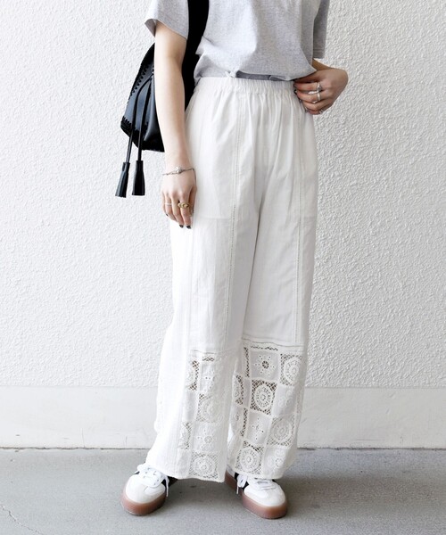 【25SS】 〈デザインポイント〉 パッチワークのようなブロックレースと刺繍モチーフが存在感のあるイージーパンツ。 無地ながらセンターのハシゴ刺繍、サイドの細かなピンタック、裾の刺繍生地などデザイン性のある一枚です。 ウエストは総ゴム仕様で、ストレスフリーなリラックス感ある穿き心地に。 脛あたりまで裏地も付いているのも嬉しいポイント◎ 〈生地・素材のポイント〉 ・家庭洗濯可能(手洗いOK) 身生地にコットンローン素材を使用しています。 〈コーディネート・その他〉 Tシャツやスウェットなど、カジュアルなアイテムと合わせたミックススタイルがおすすめ。 長めのシャツチュニックやワンピースの裾からチラッとレースを覗かせる着こなしも◎ ------------------------------------- 生地の厚み:薄手 伸縮性:無 透け感:無(オフホワイト有) 光沢感:無 水洗い:可 ------------------------------------- ※着用の際は、バッグやアクセサリー、表面の粗い物への引っ掛かりに十分にご注意ください。 ※製品の特性上、洗濯の後に縮みや型崩れ、斜行(ねじれ)が生じますのでご留意ください。 ※屋外での撮影画像は、光の当たり具合で色味が多少異なって見える場合があります。商品の色味は、スタジオでの詳細画像をご参照ください。 ※末永く愛用頂く為に、アテンションタグ・洗濯ネームを必ずご確認の上、着用又はお取り扱い下さい。 ※画像の商品はサンプルです。 実際の商品と仕様、加工、サイズが若干異なる場合がございます。