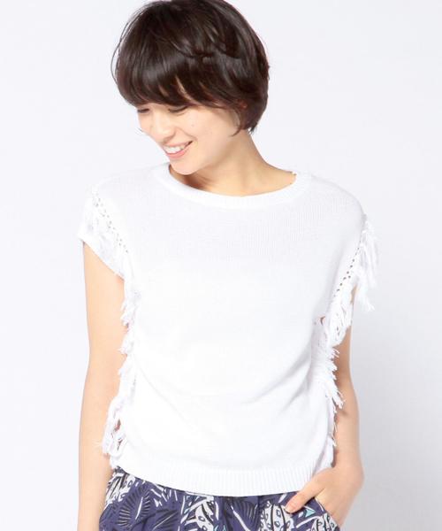 フリンジメッシュコンビプルオーバー☆両サイドにフリンジを施した、今年らしさを感じさせるトップス。軽やかで柔らかい素材感は着心地が良く、また、さり気なく肩のラインをカバーできるデザインも嬉しいポイント◎バックにはハリのある異素材を組み合わせ、メッシュのような編み込みによって涼しげな印象に仕上げました。トレンドのボヘミアンの要素をトップスで取り入れ、存在感のあるスタイリングに。※着用、お取り扱いの際は商品についておりますアテンションタグ、洗濯ネームを必ずご確認ください。店舗にお問い合わせの際は、全国のAnother Edition店舗まで下記の品名/品番をお申し付け下さい。品名:AEBC フリンジ MESH COMBI PO品番:56186020222