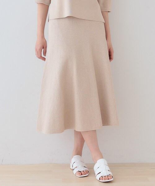 【デザインポイント】程よい厚みがあることで良質感を醸し出し、ざっくりした編み地ですが見た目以上の軽さがあり、快適な着心地を与えてくれるニット素材のフレアスカート。オンオフ問わず活躍してくれます。ウエストはゴム仕様なので快適な穿き心地も魅力の一つです。膝下の丈感で大人らしく、座った時にも足の露出が目立ちにくく上品見えが叶います。フレア感が程よく綺麗めな雰囲気のスカートは、ベーシックカラーでの展開でコーディネートをシックにまとめてくれます。【スタイリングポイント】同素材のニット(127-12453)とのコーディネートがおすすめです。その他、スッキリめのニットやカットソーとの合わせも◎。【素材ポイント】和紙を用いることでリネンのような風合いとスッキリとしたドライタッチが特徴の素材です。和紙ならではの表情感が表面感、立体感を与えます。【仕様】・ポケットなし・ウエスト総ゴム・裏地あり※照明の関係により、実際よりも色味が違って見える場合があります。また、パソコン・スマートフォンなどの環境により、若干製品と画像のカラーが異なる場合もございます。【生地詳細】透け感:なし伸縮性:あり生地の厚み:普通裏地:あり洗濯方法:手洗い可モデル情報:身長167cm B79 W59 H87 着用サイズ:38(M)店舗へのお問い合わせ商品番号:127-72453●製品寸法:05(XXS):W57cm 総丈67cm13(LL):W74cm 総丈75cm15(3L):W78cm 総丈75cm19(5L):W84cm 総丈76cm36(S):W61cm 総丈70cm38(M):W64cm 総丈72cm40(L):W67cm 総丈74cm備考: