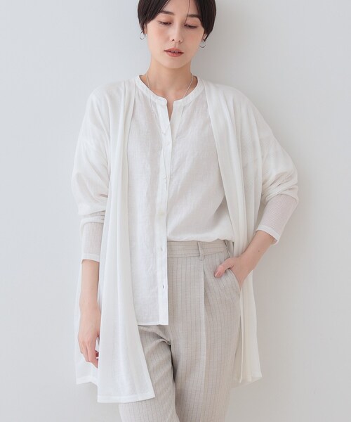 【デザインポイント】繊細な針抜きストライプによりシアー感あるジャージ素材を使用しています。サラッとした肌触りと落ち感が着ていて心地良い着流しカーディガンです。シワになりにくくかさばらないので、バッグに忍ばせて防寒対策としても活躍します。軽さを活かしたロング丈の新デザインです。肩から身幅にかけては身体から離れたサイジングで、袖周りはやや細身にすることでメリハリあるシエルエットに仕上げています。【スタイリングポイント】お仕事スタイルからデイリー使いまで汎用性の高いアイテムです。ロング丈でたっぷりした分量感があるためパンツスタイルがおすすめです。【素材ポイント】シアーな表情感が特徴のジャージ素材になります。シャリ感のあるさらっとした清涼感のある風合いにストレッチ性を持った快適な着心地、シワになりにくいイージーケア性/接触冷感性も兼ね備えた素材になっております。※照明の関係により、実際よりも色味が違って見える場合があります。また、パソコン・スマートフォンなどの環境により、若干製品と画像のカラーが異なる場合もございます【生地詳細】透け感:ややあり伸縮性:ややあり生地の厚み:普通裏地:なし洗濯方法:洗濯機洗い可モデル情報:身長167cm B79 W59 H87 着用サイズ:38(M)店舗へのお問い合わせ商品番号:127-31005●製品寸法:05(XXS):着丈72cm B94cm 裄丈69cm13(LL):着丈80cm B140cm 裄丈77cm15(3L):着丈80cm B144cm 裄丈77cm38(M):着丈78cm B128cm 裄丈75cm備考: