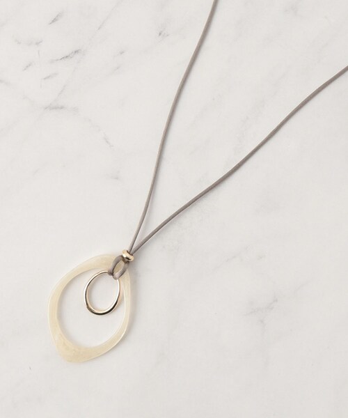 【デザインポイント】 上品な光沢感のあるシルク調サテンコードを使用したワントップロングネックレスです。 マーブル調のナチュラルな樹脂パーツとメタルを組み合わせたデザイン性あるトップが特徴です。 夏のシンプルなアイテムにプラスするだけでこなれ感あるスタイルに仕上げてくれます。 フリーで長さは調節いただけます。 【スタイリングポイント】 夏のシンプルスタイルやワンピース、和紙ニットなどにプラスするのがおすすめです。 ※照明の関係により、実際よりも色味が違って見える場合があります。また、パソコン・スマートフォンなどの環境により、若干製品と画像のカラーが異なる場合もございます。 店舗へのお問い合わせ商品番号:127-02401 ●製品寸法: 00:全長80cm モチーフH6.5cm モチーフW4.7cm 付属袋H12.5cm 付属袋W11.5cm 備考: