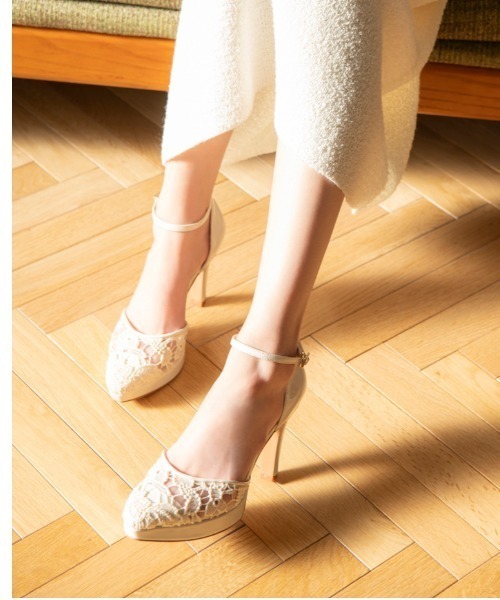 繊細なレース使いが大人のフェミニンムードが高めてくれるパンプス。透け感のあるアッパーで軽やかな足元でスッキリ!セパレートデザインなので、程良い抜けもプラスして美脚効果を発揮します。高めだけど安定感のあるヒールにアンクルストラップでホールド感もバッチリ!ドレスシーンにぴったりのアイテムです♪