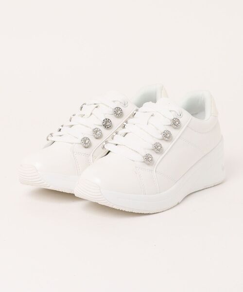 JEWEL CASKET ジュエルキャスケット 厚底ビジューハトメスニーカー 【商品説明】 ・華やかデザイン: キラキラ輝くビジューハトメが、足元を華やかに彩ります。 シンプルなスタイリングも、この一足でワンランクアップ。 ・厚底エアークッション: 約6cmの厚底ソールで、美脚効果も期待できます。 エアークッション入りで、歩行時の衝撃を吸収し、疲れにくさも◎ ・こだわりのディテール: ビジューハトメが、さりげないアクセントに。 スムース素材で、上品な印象をプラス。 ・2色展開: どんなスタイルにも合わせやすい、定番のブラックとホワイトをご用意。 色違いで揃えて、気分に合わせて履き替えるのもおすすめです。一年中活躍します。 ※WEB限定デザインです。 ※照明の関係により、実際よりもやや明るく見える場合がございます。またお手元のパソコンなどの環境により、製品と画像のカラーが若干異なる場合もございます。予めご了承ください。