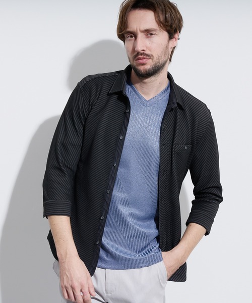 ■デザイン 衿端にワイヤ-を仕込んだショートレギュラーカラー7分袖シャツになります。 別生地にブラック×ホワイトのピンストライプのシャツ生地を使用し、尚且つバイヤス使いすることでアクセントになり、大人綺麗目に仕上げました。 オリジナルの配色ボタンがちょっとしたアクセントになっています。 ■サイズ ほどよいリラックスフィットで着心地抜群。 ウエストにやや絞りを入れたシャープなシルエットも魅力です。 ■素材 ピッチ変化のあるタック編みの凹凸と質感の違う2種類のポリエステル糸でボーダーを表現しました。 原着ブライト糸の光沢がアクセントとして効いています。 合繊の為、軽くて張りがありスポーツウエアの様な快適な着用感が特徴。 速乾性と防シワ性にも優れています。 伸縮性:あり 生地の厚さ:普通 ■注意点 衿端に付属としてプラスティック線材を使用しています。 局部的に繰り返し折り曲げたり、その部分にアイロンをあてないで下さい。