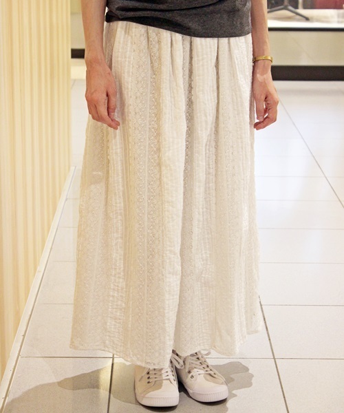 アンティークレースを贅沢に使用したマキシスカート。総レースで、これからの季節ナチュラル感ある装いにぴったりです。スニーカーやサンダル、トングなどカジュアルなテイストに合わせると、程よい抜け感も出たコーディネートができます。ワンピースにもなる肩紐がついているので、気分によってスタイリングを変えても可愛い一枚です。 ※店頭・外での撮影画像は、光の当たり具合で色味が違って見える場合があります。商品の色味は、スタジオ撮影の画像をご参照ください。 スタッフ身長 158cm