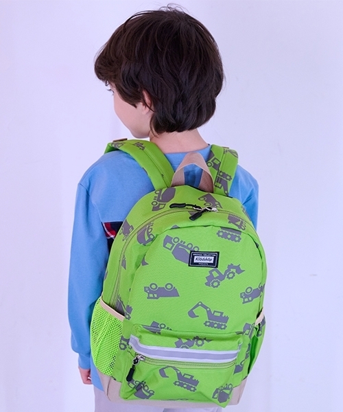 働く車がちりばめられた総柄デザインのリュックです。光に反射することで視認性を高めるリフレクター機能をプラスしました。肩紐の長さを調節できるため、成長に合わせて使用可能。肩からずれ落ちにくいようにチェストベルトも備えています。お名前ネームつきです。乗り物