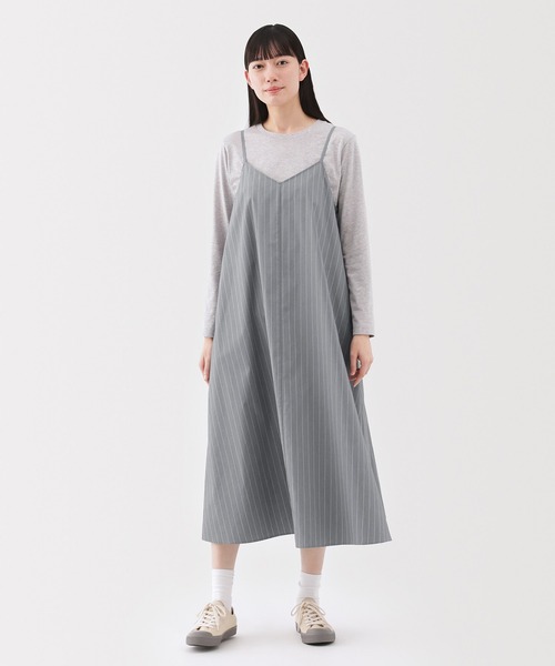 洗濯後シワが目立ちにくく、乾きやすい綿混素材を使いました。綿はオーガニックコットンです。【素材】綿とポリエステルを使用した、シワになりにくく乾きやすい素材で仕立てました。伸縮性あるポリエステルの糸を使用し、しなやかさのある素材感が特長です。【デザイン】合わせるアイテムによって様々なコーディネートを楽しめる、着回しがしやすい一着です。背面にゴムが入っているのでサイズの調整がしやすく、着脱もしやすい仕様です。肩ひものアジャスターで丈感の調整もできます。前面はすっきりとしたデザインで背面はギャザー入り、足さばきもよく動きやすいワンピースです。【仕様】透け感:なし伸縮性:なしフィット感:普通お取扱い上のご注意 : ●濃色製品は使用中の摩擦や濡れた状態での接触により色移りする事があります。洗濯の際は他のものと分けて洗ってください。お洗濯上のご注意 : ●淡色製品には蛍光増白剤入り洗剤を使用しないでください。お洗濯上のご注意2 : ●洗濯ネットをご使用ください。お洗濯上のご注意3 : ●アイロンはあて布を使用してください。
