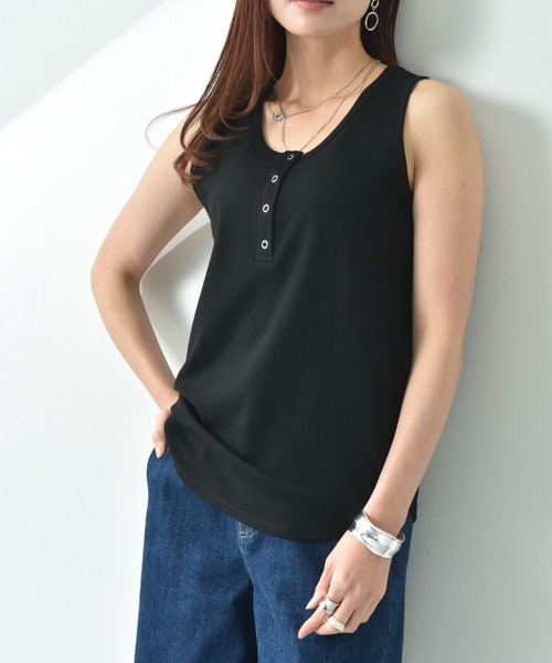 ヘンリーネックがポイント 見せるインナーとして大活躍 シンプルでありながら上品さをキープしてくれるヘンリーネック。本体は表情豊かなラッセル編みの素材を使用。ラッセル編みは形状安定性があり、通気性にも優れているので、これからのシーズンに活躍すること間違いなしです◎ ラウンドネックとヘンリーネックの前後2WAY仕様で、ネックの開いたカットソーやワンピース、シャツのインナーとして活躍◎また、夏に向けてリネンやコットンとも相性が良く、アウトドアやフェスなどの野外イベントでも目を惹くお勧めな1枚です。 ■取り扱い ご自宅でイージーケア(手洗い)ができます。 INTERPLANET/actuel(インタープラネット/アクチュエル) ■concept いつだって私らしく、私自身のスタイルが決まる。。。時代や年齢に媚びない『らしさ』を纏って生きる女性へ。旬なベーシックと抜け感のあるカジュアルをMIX。そんな大人カジュアルコーデを提案します。 ■お気に入りの登録について ショップ・ブランドのお気に入り登録でクーポンやタイムセールの通知などお得な情報を受け取ることができます♪また、気になるアイテムのお気に入り登録でセールや再入荷の通知など受け取ることができます。
