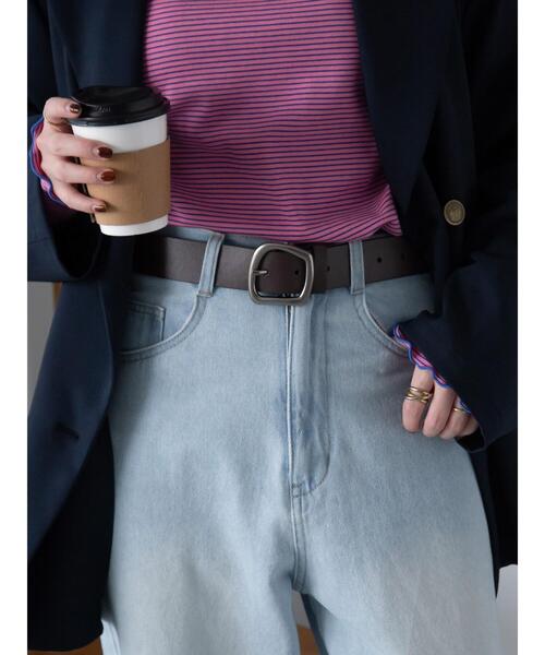 変形デザインのバックルが個性をプラスするエコレザーベルト。 シンプルながらも目を引くデザインで、スタイリングのこなれ感もさりげなくアップしてくれます。 ボトムスと合わせるのはもちろん、ワンピースやロング丈トップスのウエストマークなどにも活躍してくれる便利なアイテムです。 【その他採寸】 F ウエスト:[最小]73cm[最大]89cm たて:[バックル]5cm よこ:[バックル]5cm 全長:100.5cm